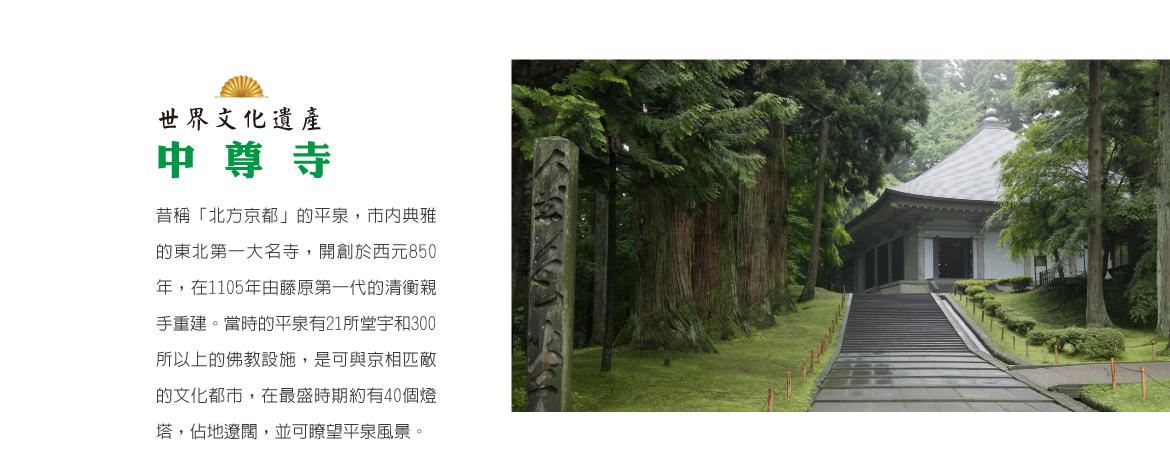 【平泉中尊寺】於2011年6月被登錄為世界文化遺產的中尊寺,昔稱「北方京都」的平泉,市內典雅的東北第一大名寺,開創於西元850年,在1105年由藤原第一代的清衡親手重建。當時的平泉有21所堂宇和300所以上的佛教設施,是可與京相匹敵的文化都市,在最盛時期約有40個燈塔,佔地遼闊,並可瞭望平泉風景。