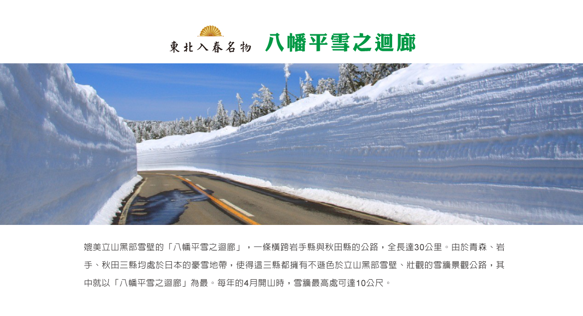 【雪之迴廊】媲美立山黑部雪壁的「八幡平雪之迴廊」,是一條橫跨岩手縣與秋田縣的公路,全長達30公里。由於青森、岩手、秋田三縣均處於日本的豪雪地帶,使得這三縣都擁有不遜色於立山黑部雪壁、壯觀的雪牆景觀公路,其中就以「八幡平雪之迴廊」為最。每年的4月開山時,雪牆最高處可達10公尺。且由於開山的時間與櫻花季相當,「八幡平雪之迴廊」也成了日本少數可以同時看到櫻花與雪牆的公路。