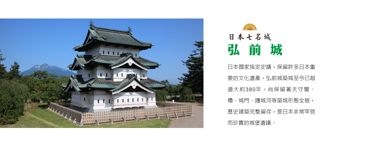 【弘前城】弘前城是日本國家指定史蹟,保留許多日本重要的文化遺產,知名作家司馬遼太郎在其著作「行走街道,北方的Mahoroba」中,以「日本七名城之一」介紹弘前城,其代表性可見一斑。弘前城築城至今已超過大約380年,尚保留著天守閣、櫓、城門、護城河等築城形態全貌,歷史建築完整留存,是日本非常罕見而珍貴的城堡遺蹟。