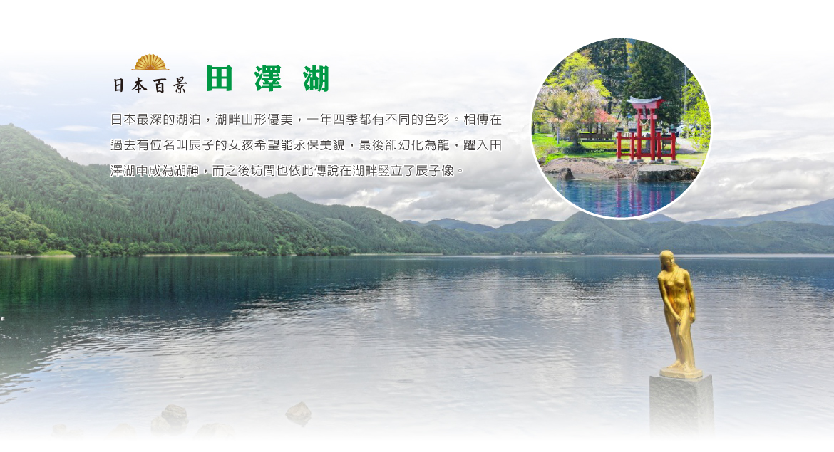 【田澤湖】面積25.5平方公里,深達423.4公尺,是日本最深的湖泊,湖畔山形優美,一年四季都有不同的色彩。田澤湖還有一個古老的傳說,據說在湖邊的村莊裡有一位叫“辰子”的姑娘,希望獲得永遠的美麗,她肯求觀音,觀音讓她喝乾湖水,結果在喝乾湖水之前,她變成了一條龍,沉到了湖底,這個傳說告誡人們不要過於貪求。