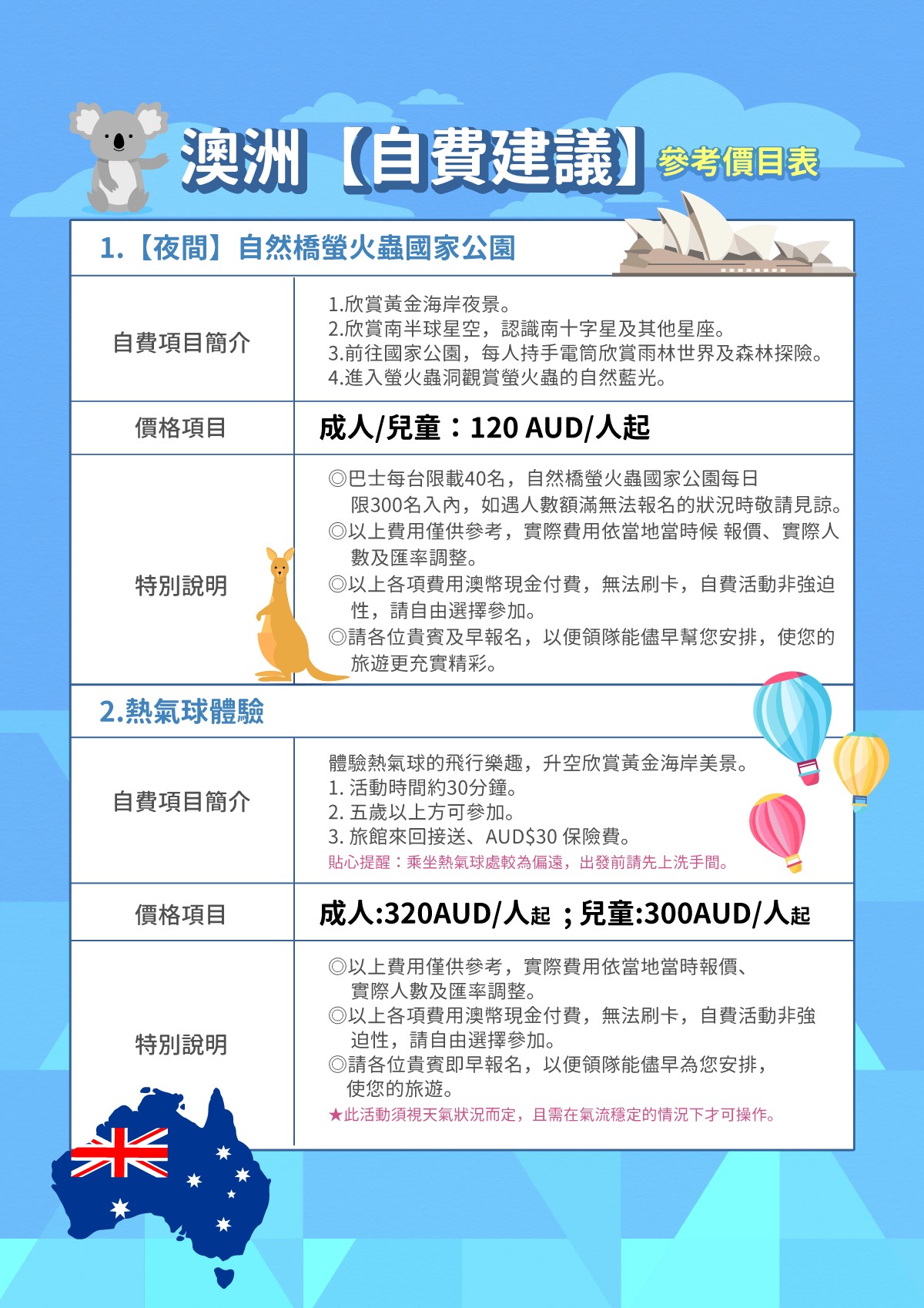 為了讓您的旅程更加難忘,我們特別推薦以下兩項黃金海岸必體驗的活動,您可以在行程空檔的夜晚或清晨,為旅行增添更多色彩!
