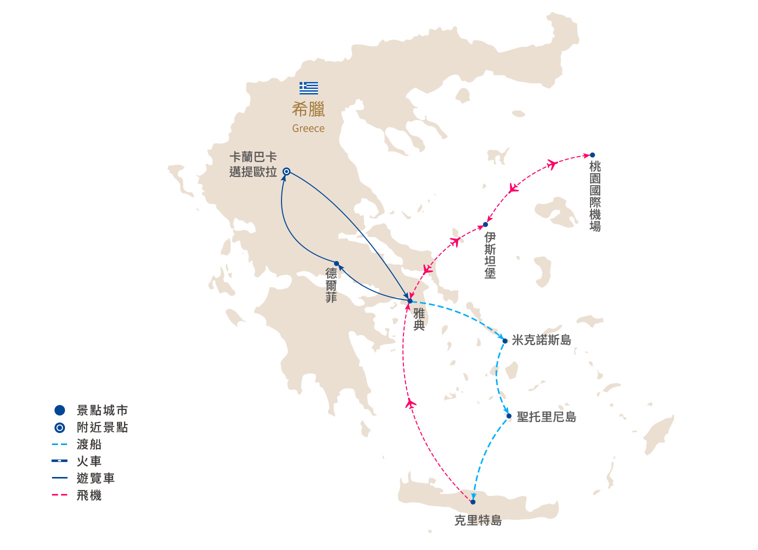 參考行車距離|雅典—75KM-科林斯-45KM麥錫尼-20KM 那普良-30KM埃皮達魯斯-140KM雅典