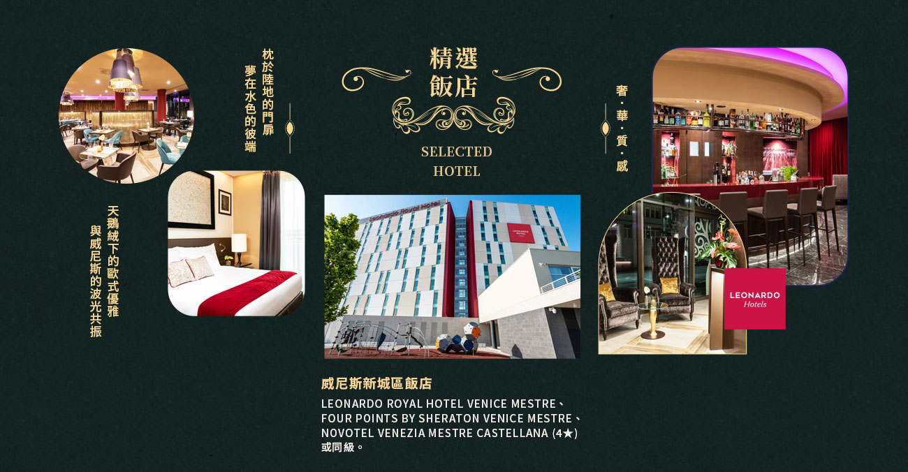 住宿:LEONARDO ROYAL HOTEL VENICE MESTRE、FOUR POINTS BY SHERATON VENICE MESTRE、NOVOTEL VENEZIA MESTRE CASTELLANA (4★)或同級