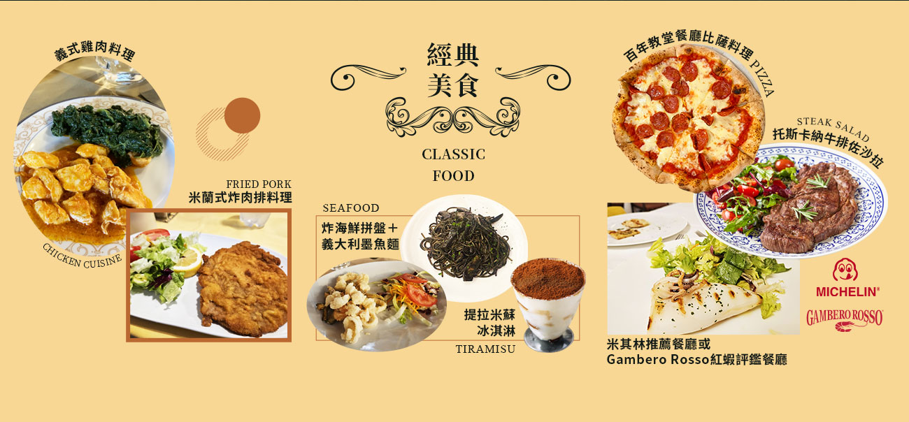 早餐:飯店內早餐 午餐:義式雞肉料理 晚餐:米其林推薦餐廳或Gambero Rosso紅蝦評鑑餐廳
