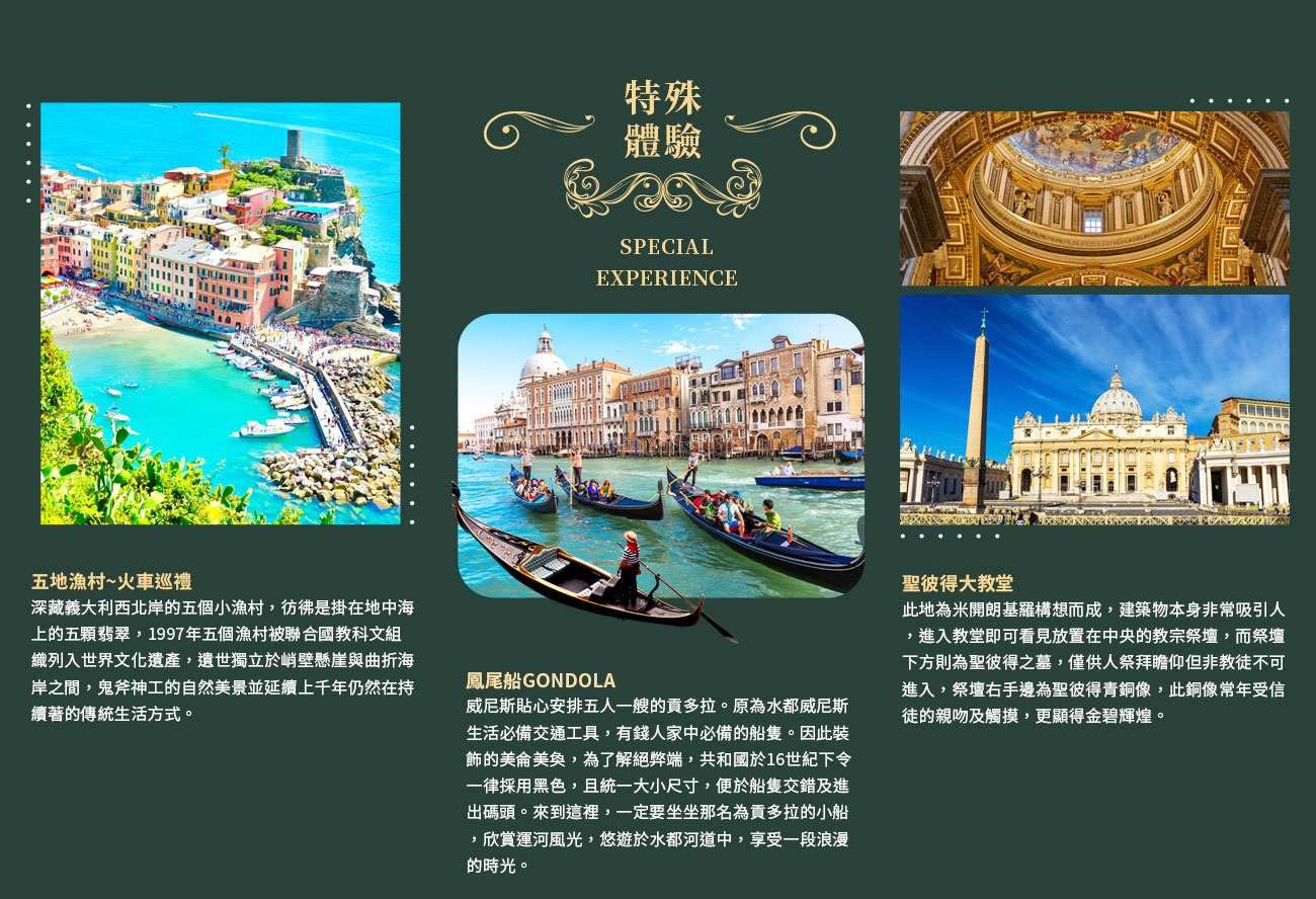 世界最美迷濛水都之城-,莎士比亞劇中之〔威尼斯商人〕的所在地。而其中可看到,最大特色是街上看不到汽車行駛及沒有車聲喧囂,所有的交通工具完全浮於水面。 ★搭乘汽船前往有『歐洲會客廳』之稱的聖馬可廣場。來到喧擾的◎聖馬可廣場,眼前融合了古典、羅馬、歌德及拜占庭式精緻的◎聖馬可教堂已然擄獲了您的視覺心靈!接續來到◎嘆息橋【聽說戀人們在嘆息橋下接吻就可以天長地久,其典故來自一九七九年的電影《情定日落橋》(A Little Romance),在這裡取景,男女主角在橋下接吻呢!】。