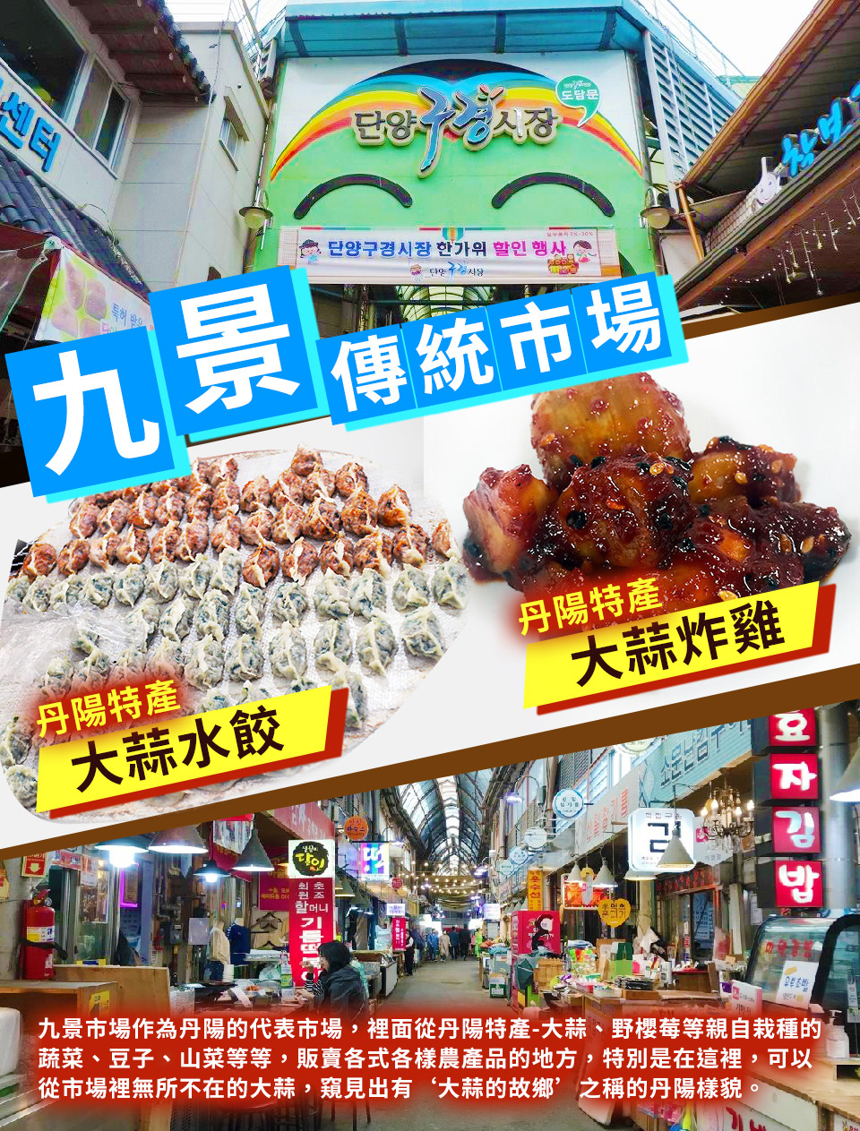 【九景傳統市場】九景市場作為丹陽的代表市場,裡面從丹陽特產-大蒜、野櫻莓等親自栽種的蔬菜、豆子、山菜等等,販賣各式各樣農產品的地方,特別是在這裡,可以從市場裡無所不在的大蒜,窺見出有‘大蒜的故鄉’之稱的丹陽樣貌。市場裡從大蒜炸雞開始,大蒜水餃、一直到大蒜血腸為止,在這裡可以嚐到利用大蒜變化出的各式料理!