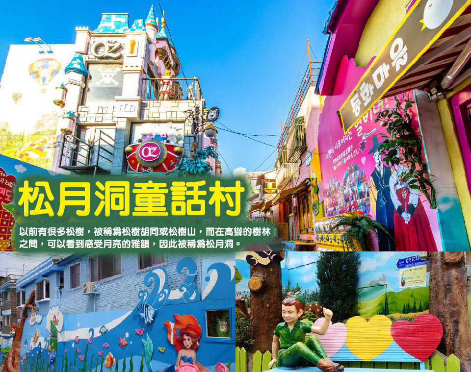 【松月洞童話村】以前有很多松樹,被稱為松樹胡同或松樹山,而在高聳的樹林之間,可以看到感受月亮的雅韻,因此被稱為松月洞。1883年仁川港開港後,從德國人開始,外國人逐漸聚居在這裡,形成特殊的國際聚落。數十年前開始,年輕人到外地發展,留在這裡大部分都是年長的長輩,松月洞逐漸遺失了活力,發展也停滯不前,空著的房子崩壞,生活環境也變差。為了改善如此狀況,和韓國其他的老舊社區一樣,展開改善再造計畫,但不同的是,沿襲松月洞的西洋歐風背景,將這裡打造成結合世界名作童話故事的夢幻主題區域,用各種花卉組合而成的豐富小徑,在老舊的牆面上著色,富含童心的可愛圖畫和造景,讓松月洞變身成可以作夢、有希望的童話村。