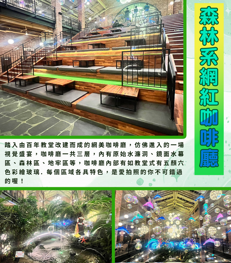 【森林系網美咖啡廳(不含飲品)】踏入由百年教堂改建而成的網美咖啡廳,仿佛進入的一場視覺盛宴,咖啡廳一共三層,內有原始水濂洞、鏡面水幕區、森林區、地牢區等,咖啡廳內部有如教堂式有五顏六色彩繪玻璃. 每個區域各具特色,是愛拍照的你不可錯過的喔!