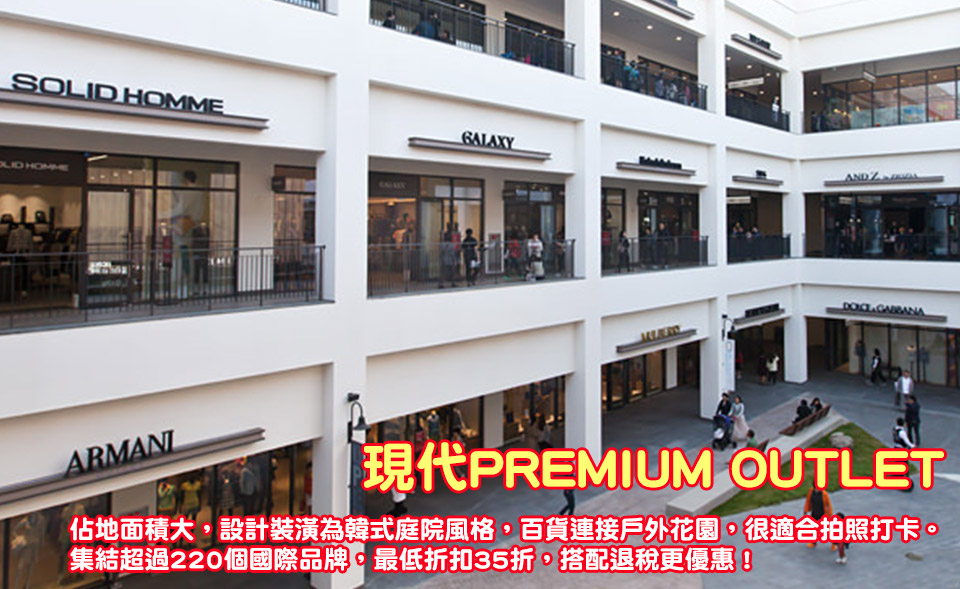 【現代PREMIUM OUTLET】佔地面積大,設計裝潢為韓式庭院風格,百貨連接戶外花園,很適合拍照打卡。集結超過220個國際品牌,最低折扣35折,搭配退稅更優惠!