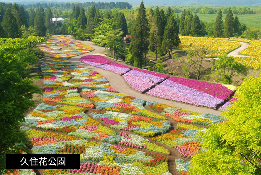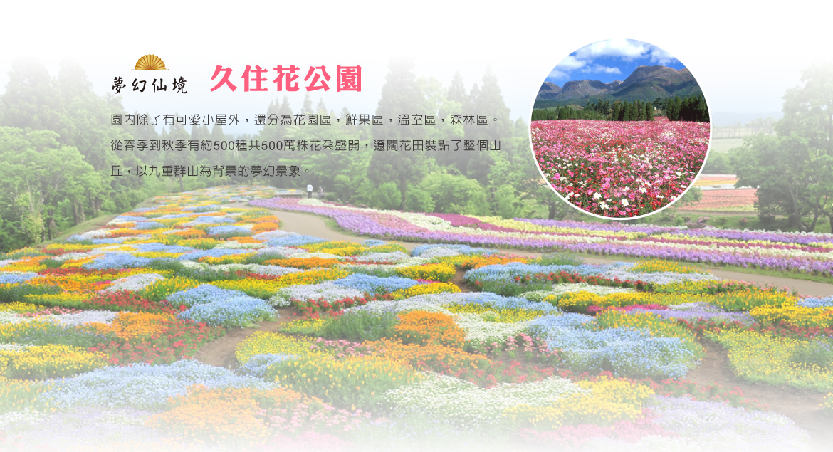 【久住花公園】(芝櫻預估時間4月中旬~5月上旬)這座大型花園占地20公頃,位於海拔標高800公尺的久住高原上,園內除了有可愛小屋外,還分為花園區、鮮果區、溫室區、森林區。從春季到秋季有約500種共500萬株花朵盛開,遼闊花田裝點了整個山丘,以九重群山為背景的夢幻景象。