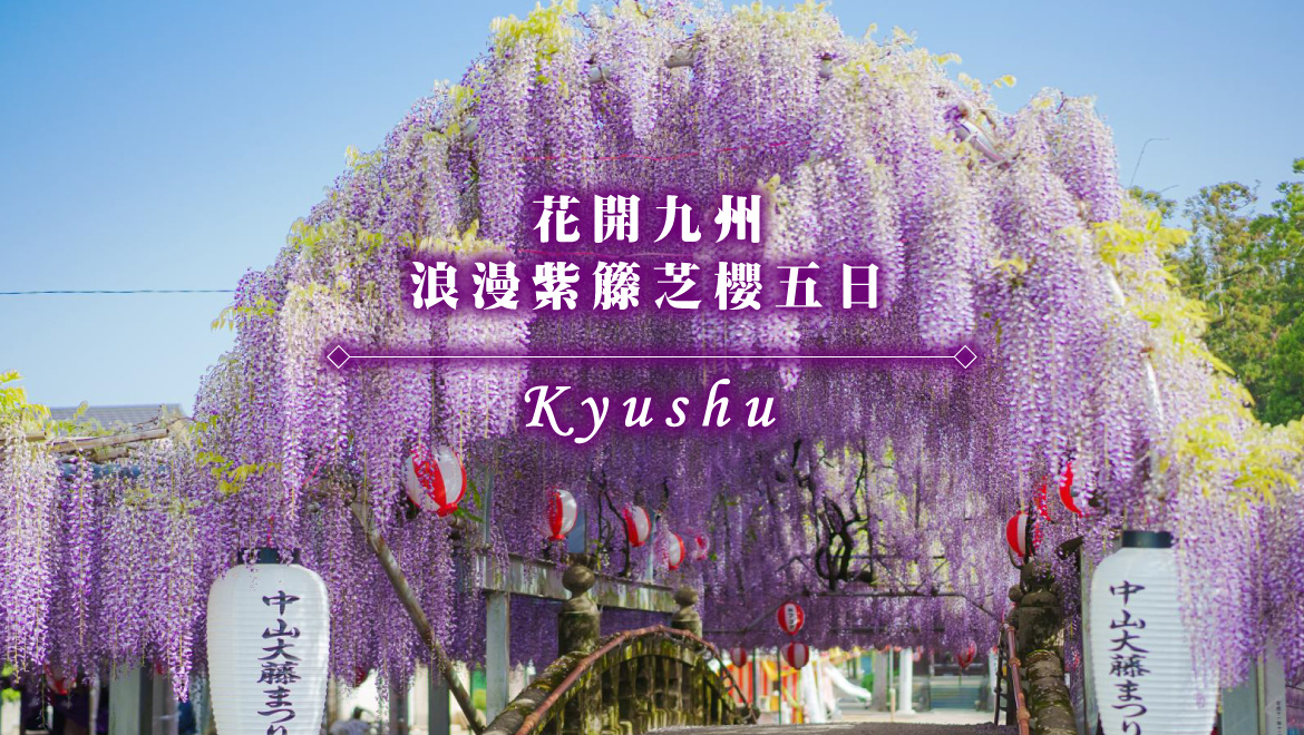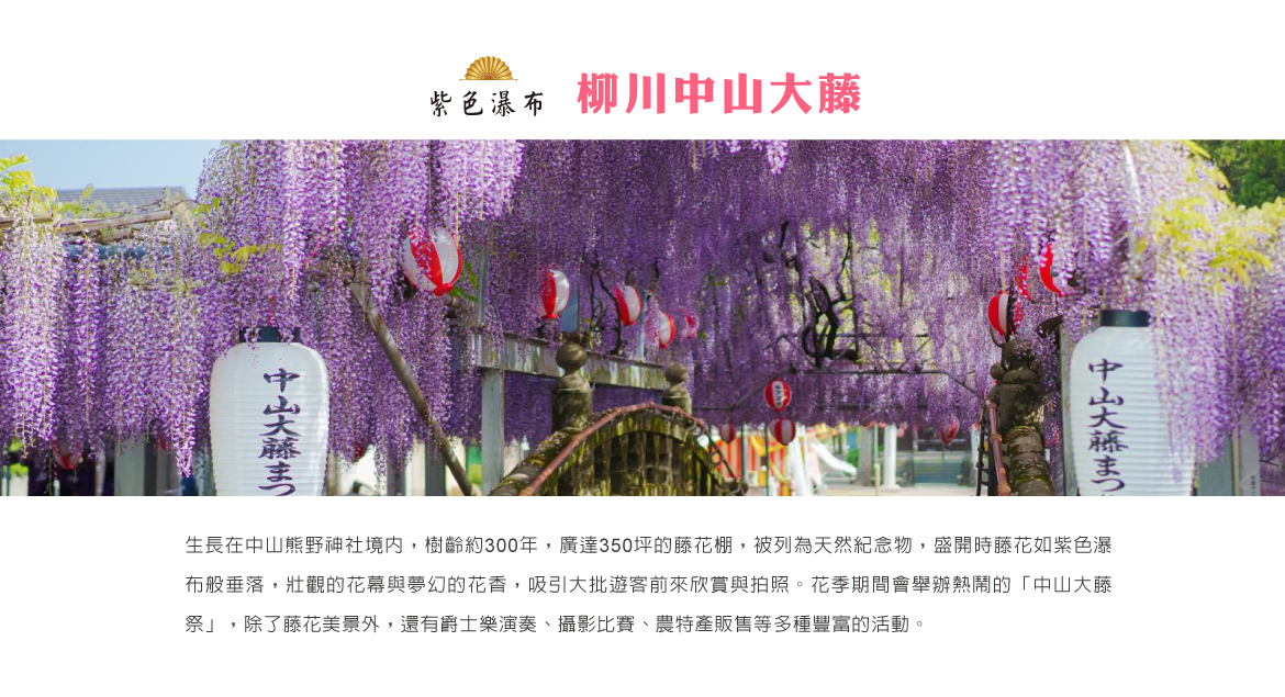 【柳川中山大藤】(紫藤預估時間4月中旬~4月下旬)生長在中山熊野神社境內,樹齡約300年,廣達350坪的藤花棚,被列為天然紀念物,盛開時藤花如紫色瀑布般垂落,壯觀的花幕與夢幻的花香,吸引大批遊客前來欣賞與拍照。花季期間會舉辦熱鬧的「中山大藤祭」,除了藤花美景外,還有爵士樂演奏、攝影比賽、農特產販售等多種豐富的活動。