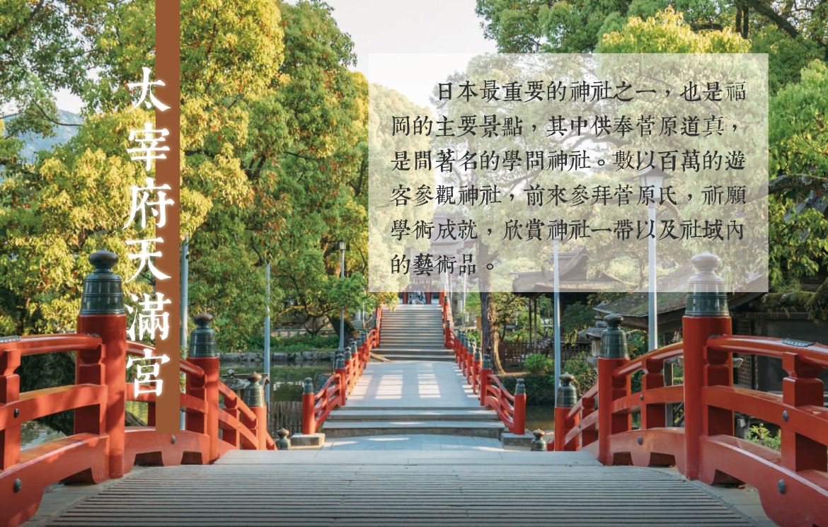【太宰府天滿宮】太宰府為日本一萬三千座天滿宮的總殿,寶物殿內有國寶「翰苑」,歷史館內記載菅原道真公一生的事蹟,庭園內則有一株千年樟木、六千株梅樹及三萬株菖蒲花、美麗多姿;由於天滿宮的園中種植梅樹,因此此處素有飛梅傳說的稱呼,而許多以梅製成的產品,寺外更有一條將近2000公尺長的石道,兩側均是土產精品及飲食店,讓您眼花撩亂。