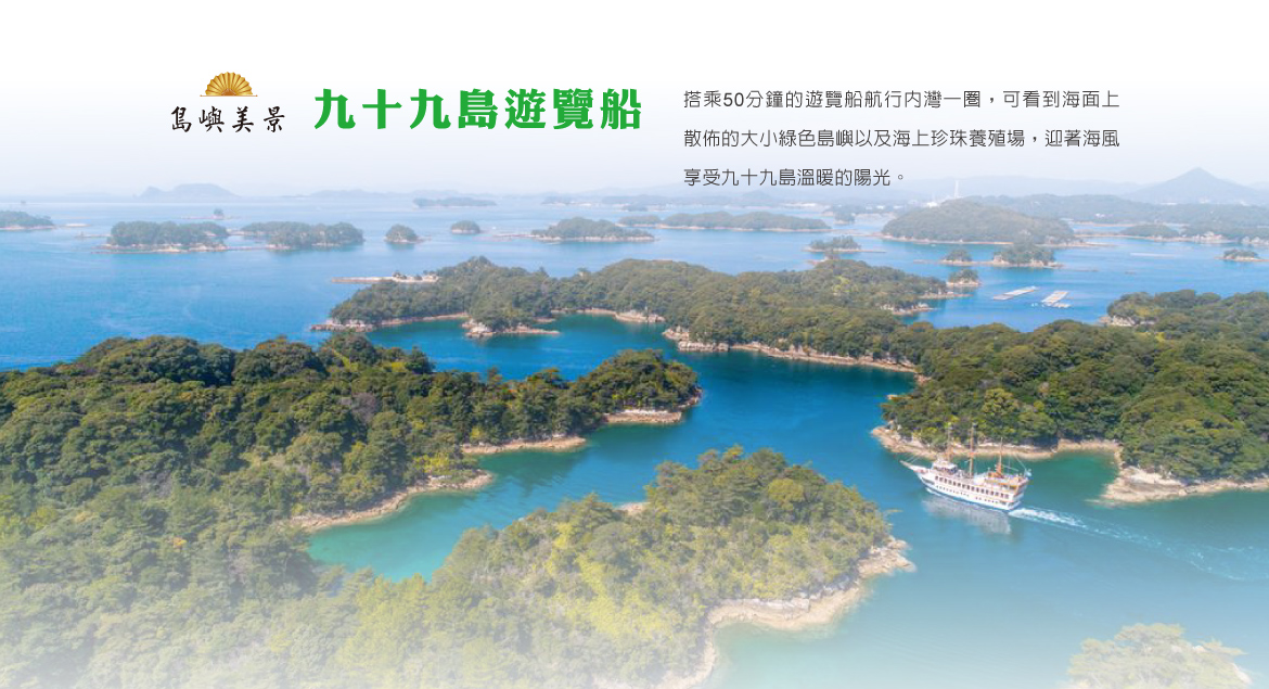 【九十九島遊船】搭乘遊覽船航行內灣一圈,可看到海面上散佈的大小綠色島嶼以及海上珍珠養殖場,迎著海風享受九十九島溫暖的陽光。