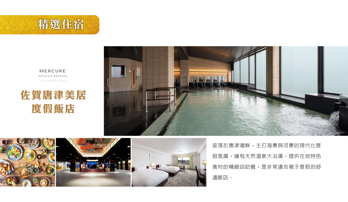 早餐:飯店內享用 午餐:佐賀豬涮涮鍋御膳 或日式風味餐 晚餐:飯店內自助餐或宴會餐