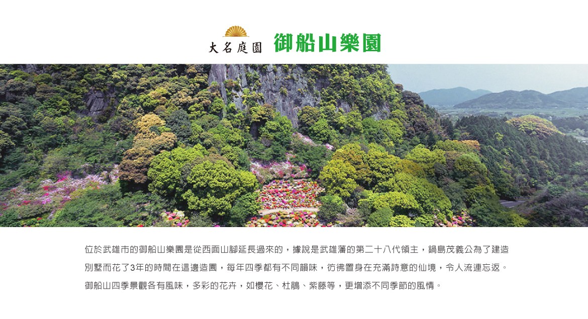 【武雄御船山樂園】位於武雄市的御船山樂園是從西面山腳延長過來的,據說是武雄藩的第二十八代領主,鍋島茂義公為了建造別墅而花了3年的時間在這邊造園,每年四季都有不同韻味,彷彿置身在充滿詩意的仙境,令人流連忘返。御船山四季景觀各有風味,多彩的花卉,如櫻花、杜鵑、紫藤等,更增添不同季節的風情。