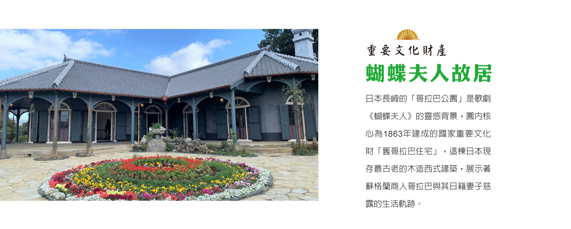 【蝴蝶夫人故居】日本長崎的「哥拉巴公園」是歌劇《蝴蝶夫人》的靈感背景,園內核心為1863年建成的國家重要文化財「舊哥拉巴住宅」,這棟日本現存最古老的木造西式建築,展示著蘇格蘭商人哥拉巴與其日籍妻子慈露的生活軌跡。該處可俯瞰長崎港、以心形石頭戀愛傳說聞名。