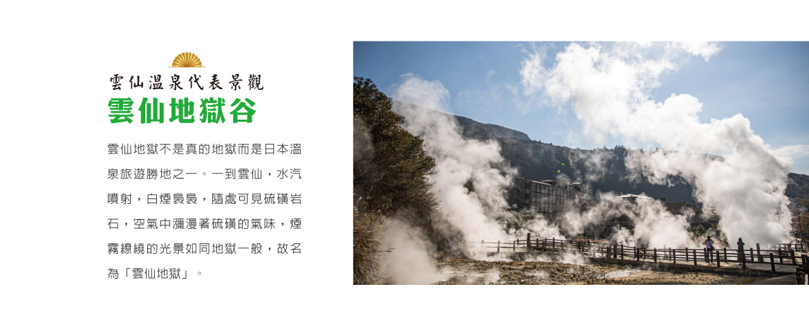 【地獄谷】由於蒸汽和溫泉酸性水的影響,而使得土壤退色變為白色的粘土狀,故被稱為「溫泉餘土」。據說溫泉的熱源是桔灣海底的岩漿流,從地底湧出裊裊白煙的蒸汽,溫度高達攝氏120度,在噴氣孔周圍附著著白色或黃色的硫磺花,雲仙的硫磺花不是沉澱在溫泉中,而是附著在地表附近,這也是雲仙地獄谷的一大特色。