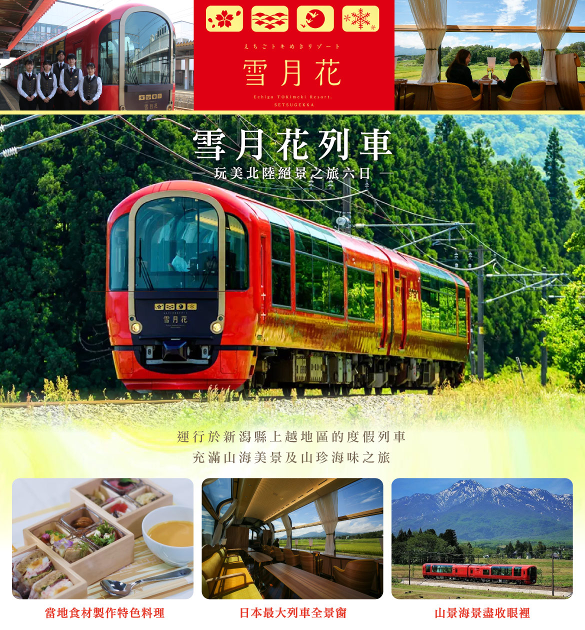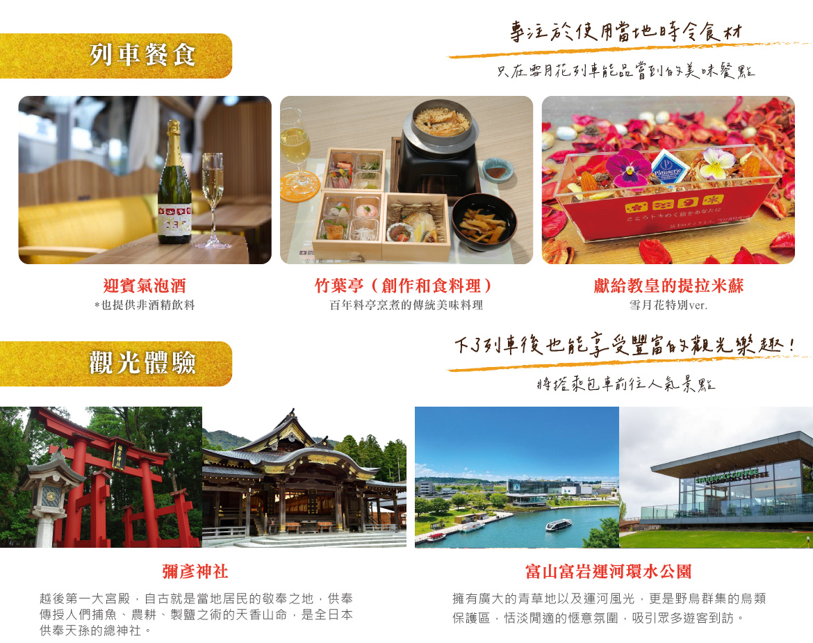 【雪月花列車】列車從牆壁到地板、再到桌椅設計,無一不是新潟當地素材,大紅色的車廂和流線型的曲線設計也是來自新潟縣的縣鳥朱鷺,全車僅兩節車廂,充滿藝術與質感的設計,空間感與光感交錯,身置舒適的氛圍,務必前往第1節車廂頭的車掌展望室好好欣賞巨大玻璃景觀窗帶來的震撼與感動。沿途可欣賞到越後富士的妙高群山、日本海絕景與鄉村田園風光等日本在地景色,通通都能一覽無遺,徹底感受越後地區特有的豐富自然文化魅力,也能體驗到觀光列車別具特色的魅力。