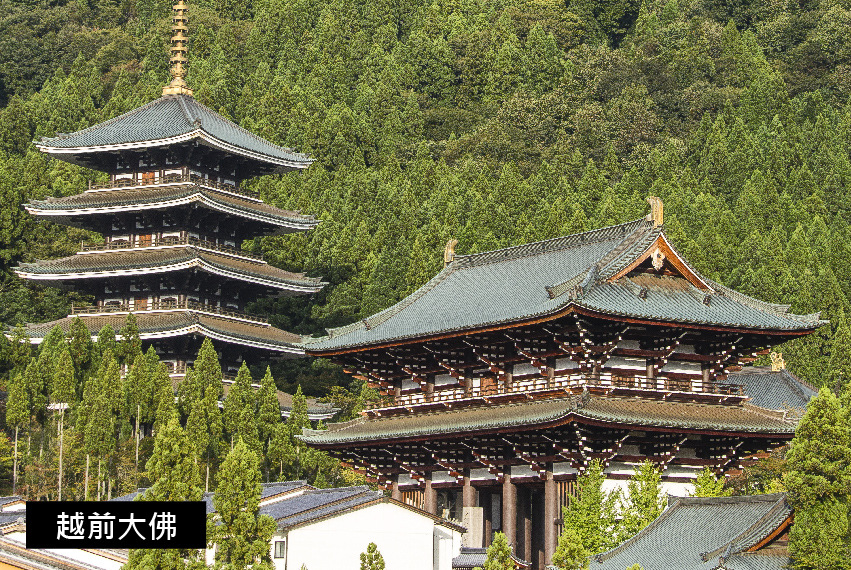 【福井永平寺】由道元禪師於1244年創建,已有七百多年歷史,座落在靜謐的山林中,擁有70多棟傳統木造建築,透過長廊相連,形成壯麗莊嚴的禪宗修行場域。寺內的七堂伽藍,包括法堂、佛殿和僧堂,是僧侶們日常修行與誦經的重要場所,至今仍有百餘名僧侶在此修行,維持著嚴謹的禪宗生活方式。