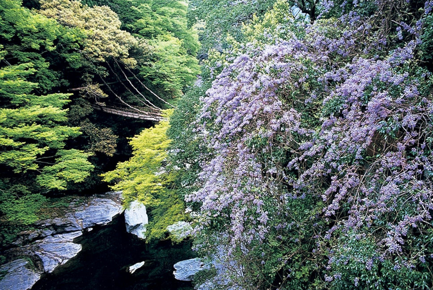 【祖谷葛藤橋】四國中部祖谷地區,自然壯觀美景為日本三大秘境之一,祖谷屬於劍山國定公園,四國第二高峰的劍山為四國山地的群峰所包圍,形成吉野川源頭的祖谷川的清流,蜿蜒曲行於群山之間形成深深溪谷。長約45米、寬約2米,距離水面約15米的葛藤橋,是用藤蔓編製的,是日本三大奇橋之一,被指定為國家的重要民俗文化財產。