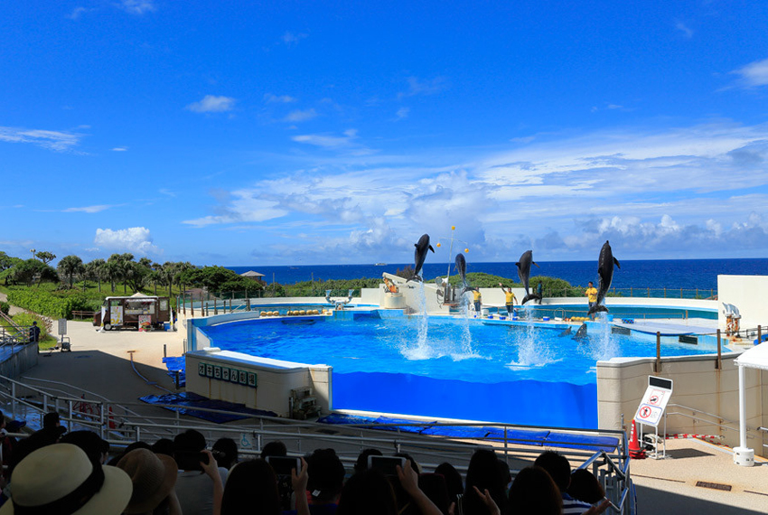 【海洋博公園】與琉球海洋有約為主題,分別有3個主題水族箱,珊瑚礁之旅、黑潮之旅及深海之旅,可以全覽沖繩沿海的水中生物,其中最棒的東亞第一大水族箱「黑潮之旅」,可以看到細長不超過手掌的條紋蝦魚和毛煙管魚、可長大至14公尺長的7公尺鯨鯊、世界最大的軟骨魚鬼蝠魟、有著黑人厚唇的曲紋唇魚,也可以看到像貌醜惡的石頭魚、章魚、蝦子等等350種奇形怪狀大大小小的海中生物,令人嘖嘖稱奇,另有海牛館、海龜館可參觀,並且欣賞可愛的海豚劇場,絕能在此渡過難忘的歡樂時光。