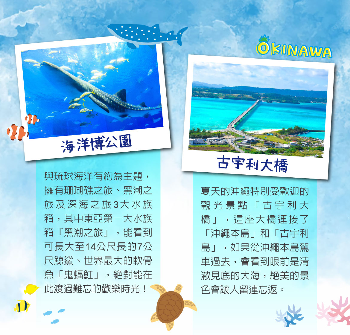 飯店→海洋博公園~欣賞海豚表演秀→跨越湛藍無敵海景~古宇利大橋→沖繩必訪美式小鎮~北谷町美國村→飯店