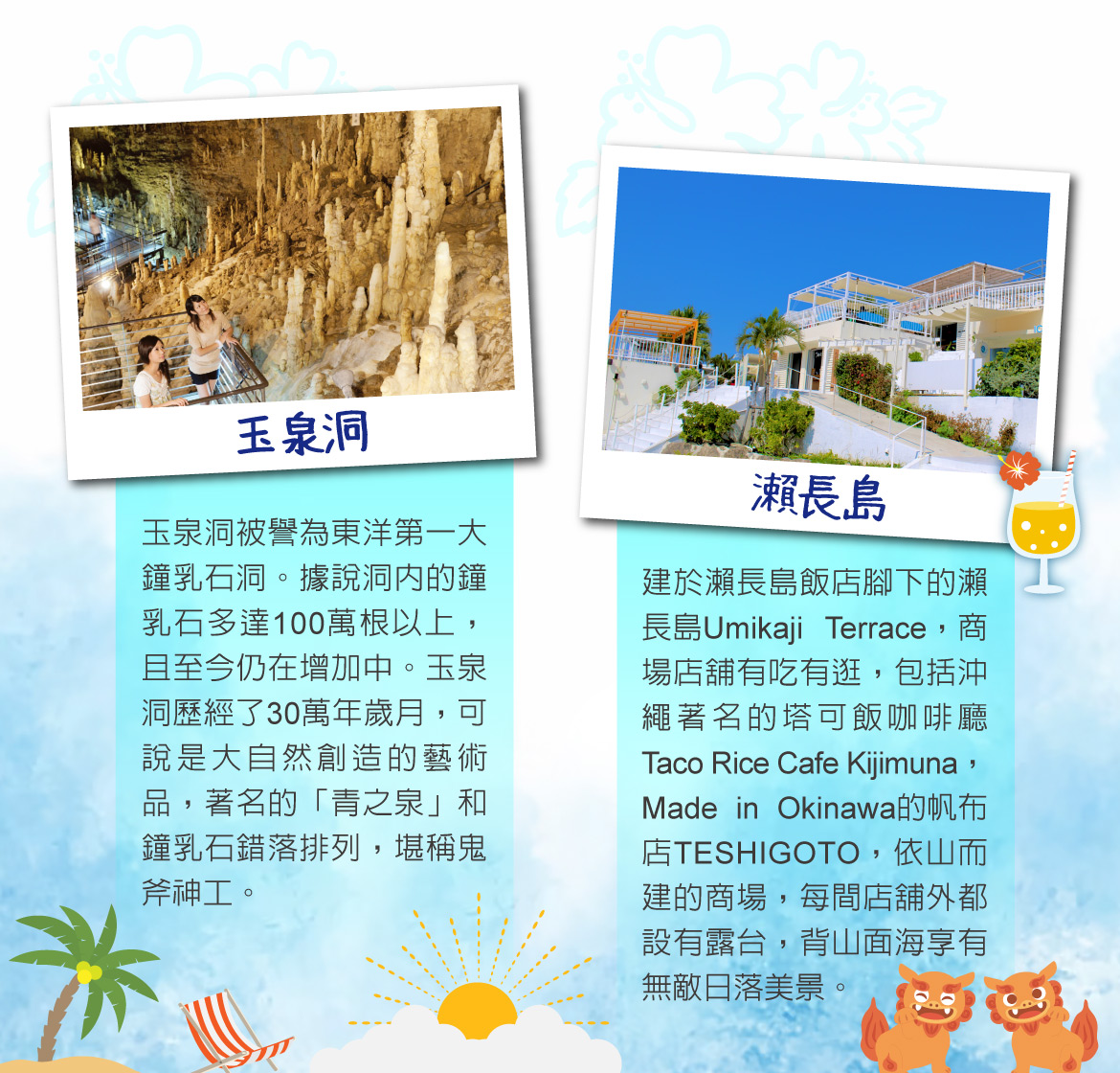 桃園國際機場/那霸空場→小希臘~瀨長島Umikaji Terrace複合型屋台村→系滿魚市場~品嘗新鮮海鮮→日本第二大鐘乳石洞~玉泉洞→飯店