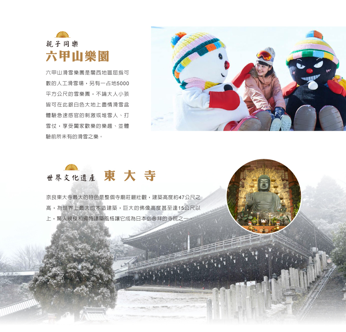 【六甲山滑雪樂園】六甲山滑雪樂園是關西地區屈指可數的人工滑雪場,場內有3條長達260公尺的專業滑雪道並提供各式滑雪設備的租用,另有一占地5000平方公尺的雪樂園,不論大人小孩皆可在此銀白色大地上盡情滑雪盆體驗急速感官的刺激或堆雪人、打雪仗,享受闔家歡樂的樂趣、並體驗前所未有的滑雪之樂。