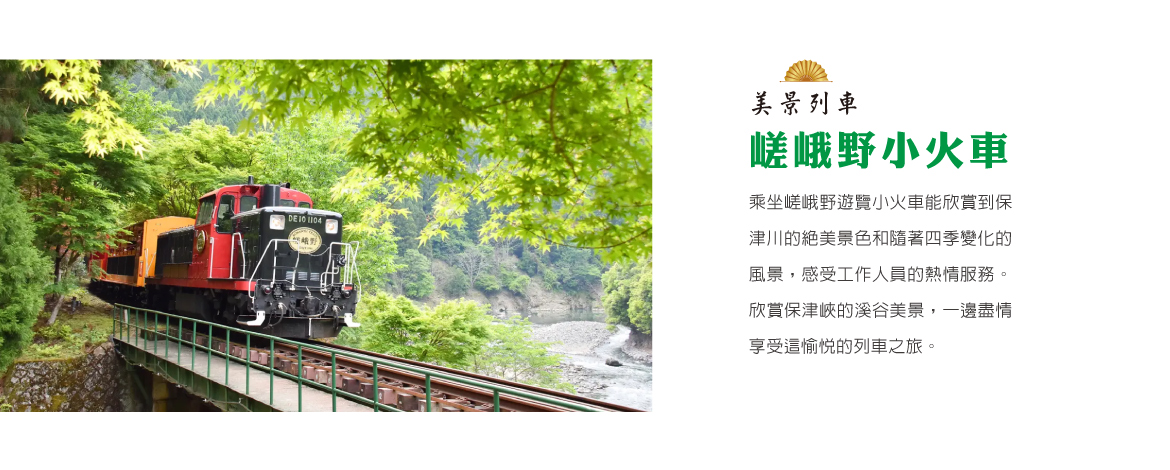 【嵯峨野觀光鐵道】嵯峨野遊覽小火車行駛在因複線電氣化而廢線的JR山陰本線舊路線上。裝飾藝術風外觀的小火車從緊鄰JR嵯峨嵐山站的小火車嵯峨站出發至小火車龜岡站約25分鐘7.3公里的車程,沿途可欣賞到保津川溪谷的四季美景。