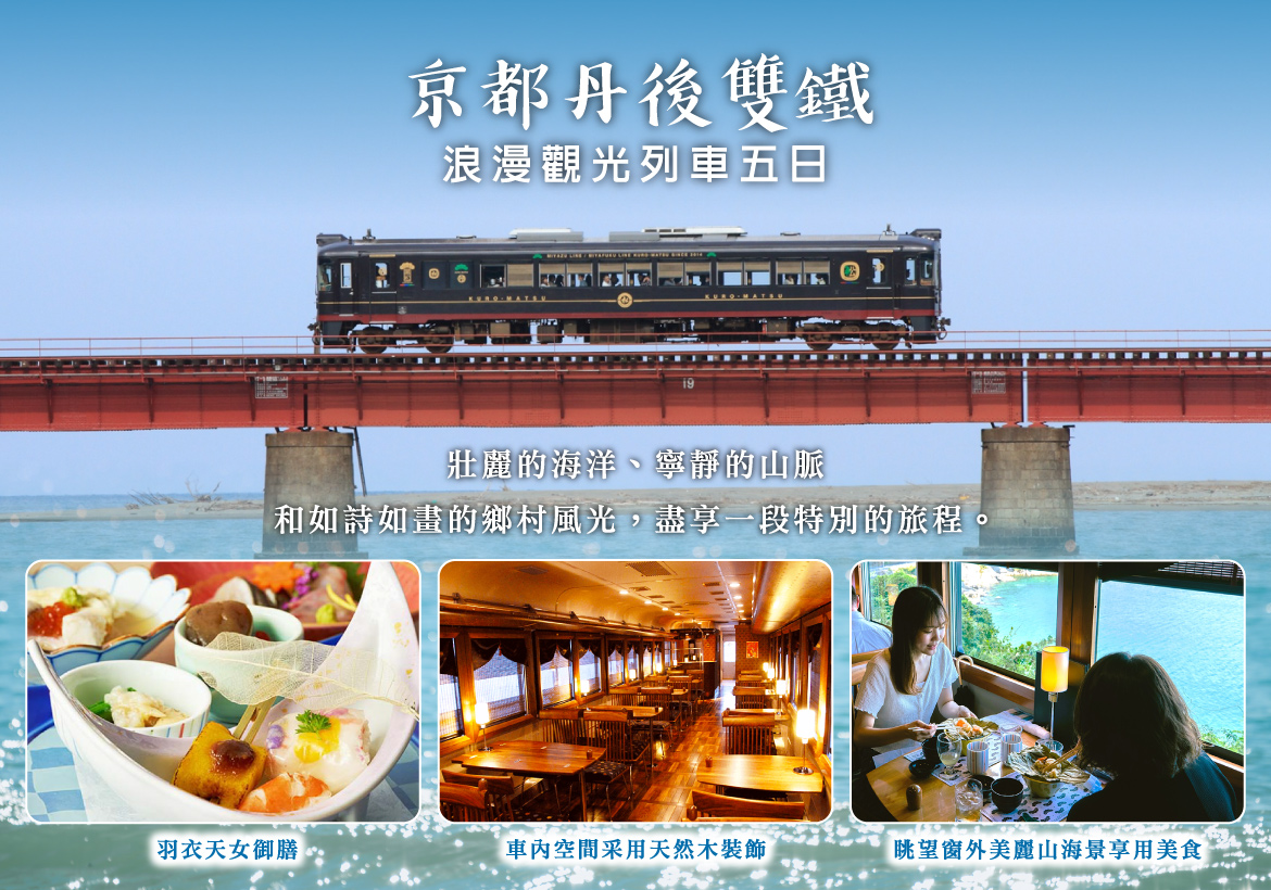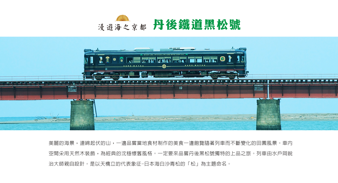 【丹後鐵道黑松觀光列車】美麗的海景,連綿起伏的山,一邊品嘗當地食材制作的美食一邊飽覽隨著列車而不斷變化的田園風景。車內空間采用天然木裝飾,為經典的沈穩懷舊風格。一定要來品嘗丹後黑松號獨特的上品之旅。列車由水戶岡銳治大師親自設計。是以天橋立的代表象征-日本海白沙青松的「松」為主題命名。