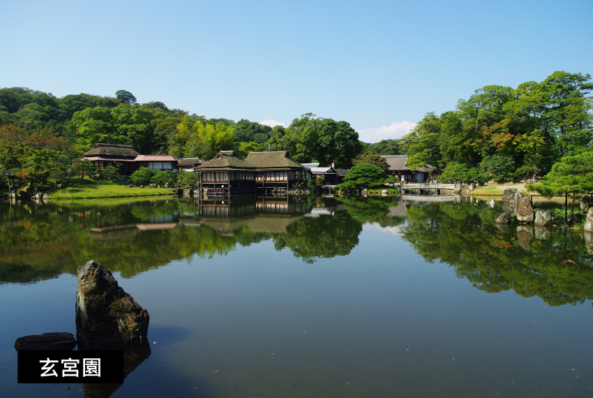 【玄宮園】是以池塘為中心而建的大池泉迴遊式日本庭園,在庭園內可以欣賞到橫跨在池塘上的九座小橋、池中的小島,還有停泊船隻的小屋。園內將樹木和岩石巧妙分佈,池畔林立著臨池閣、鳳翔台、八景亭等富有情趣的建築物,可從庭園遠望彥根城,將美景盡收眼底。