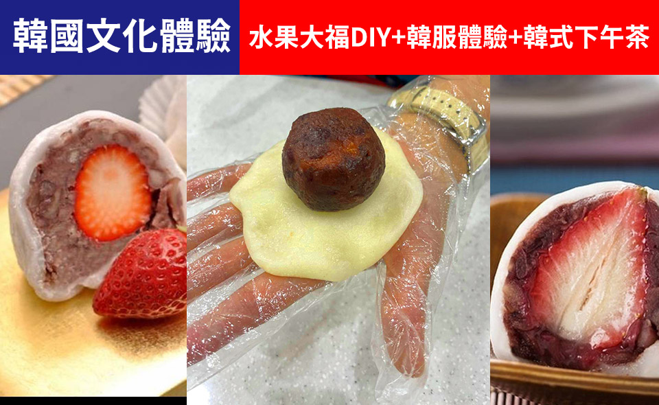 【韓國文化體驗營~水果大福DIY+韓服體驗+韓式下午茶】由專業老師示範講解,麻糬皮、內餡和水果這三個部分來製作做出自己獨一無二的水果大福。「韓服體驗」特別準備傳統韓服供貴賓們換穿,可自由穿搭各種韓劇中常出現的配件,男女古裝均有,搭配布幕背景拍照留念。
