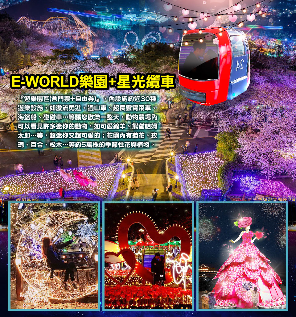 【E WORD星光櫻花節(賞夜櫻)】慶典結合櫻花季與燈節,不論白天黑夜皆有動人美景為其一大特徵。在夜間的照明下,變得五彩繽紛,呈現夢幻的氣氛,不僅將以830萬個LED燈裝飾整個E WORLD園區,遊樂園中的每條街道也準備了各式各樣的街頭表演、豐富的體驗活動、粉紅市集等,讓人目不暇給。