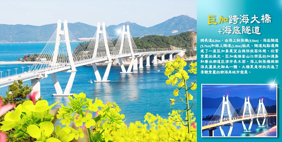 【巨加跨海大橋+海底隧道】總長達8.2km,由海上斜張橋(3.5km)、海底隧道(3.7km)和路上隧道(1.0km)組成。隧道起點還興建了一座巨加島展望台提供旅客休憩,欣賞秀麗的風光。巨加連接釜山江西區的加德島和廣尚南道巨濟市長木面,海上斜張橋與南海美麗風光融為一體,大橋更是有效促進了景觀秀麗的南海岸城市發展。