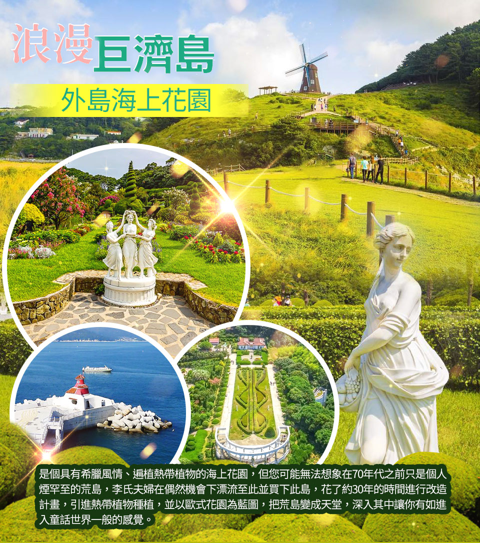 【巨濟島】位於韓國南部的巨濟島是韓國境內僅次於濟州島的第二大島嶼,一年四季氣候宜人,棕櫚樹等植物隨處可見,有外島海上農園、和有海上的金剛山之稱的海金剛、62個大小島嶼、 10多個海水浴場及俘虜收容所遺址公園、玉浦大捷紀念公園等景點,其中又以外島海上農園和海金剛最爲出名。而黑鵝卵石海水浴場則因海水拍打岸邊的黑鵝卵石所發出特有的,有別於一般沙灘海水浴場的動聽聲音而聞名。