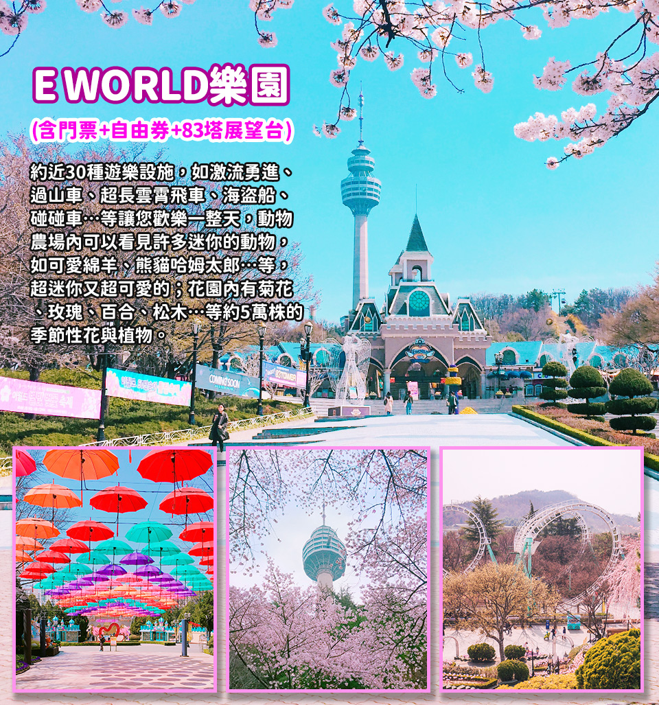 【E-WORLD樂園+83塔展望台(含門票+自由券)】內設施約近30種遊樂設施,如激流勇進、過山車、超長雲霄飛車、海盜船、碰碰車…等讓您歡樂一整天,動物農場內可以看見許多迷你的動物,如可愛綿羊、熊貓哈姆太郎…等,超迷你又超可愛的;花園內有菊花、玫瑰、百合、松木…等約5萬株的季節性花與植物。