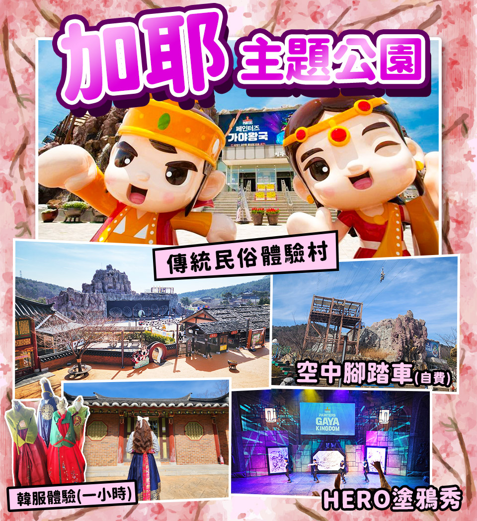 【加耶主題公園】公元42年高句麗、百濟、新羅三國一起在韓半島留下擁有燦爛歷史的伽倻王國,園內占地17萬9千平方公尺包含四季花園、展示館、民俗體驗村、星光庭院、戶外3D影像燈光秀及塗鴉秀,以伽倻文化為主題公園,相傳伽倻國國王金首露王和一位印度阿踰陀國的公主許黃玉聯姻,金首露王愛戴皇后,建了很多美麗的宮殿。整個公園除了可以瞭解當時的歷史,在這裡可以通過遊戲、體驗活動、展覽等來看、來聽、來感受完整的古伽倻的燦爛歷史。