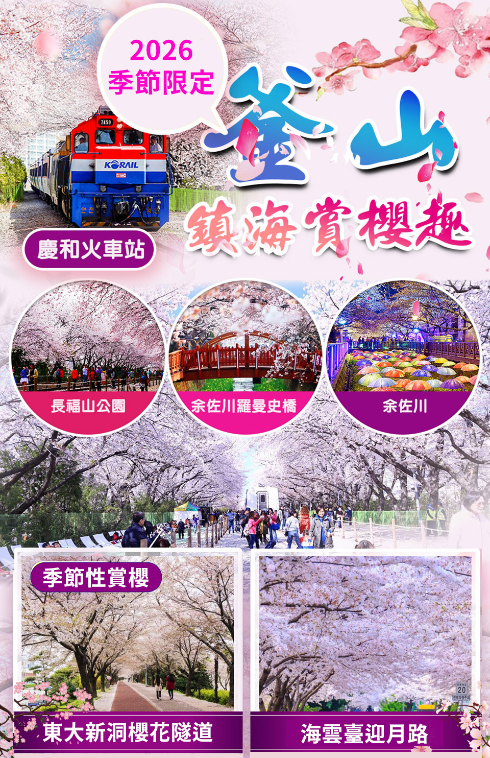2026/03/28(六) | 桃園國際機場出發 易起釜邱雙享櫻~(不進人蔘、護肝、土產)鎮海軍港節、巨濟島、櫻花隧道、星光櫻花節、加耶主題公園、長腳蟹&燒肉吃到飽五日機位 20 候補0 已售0 可售19一年一度賞櫻季節限定! |