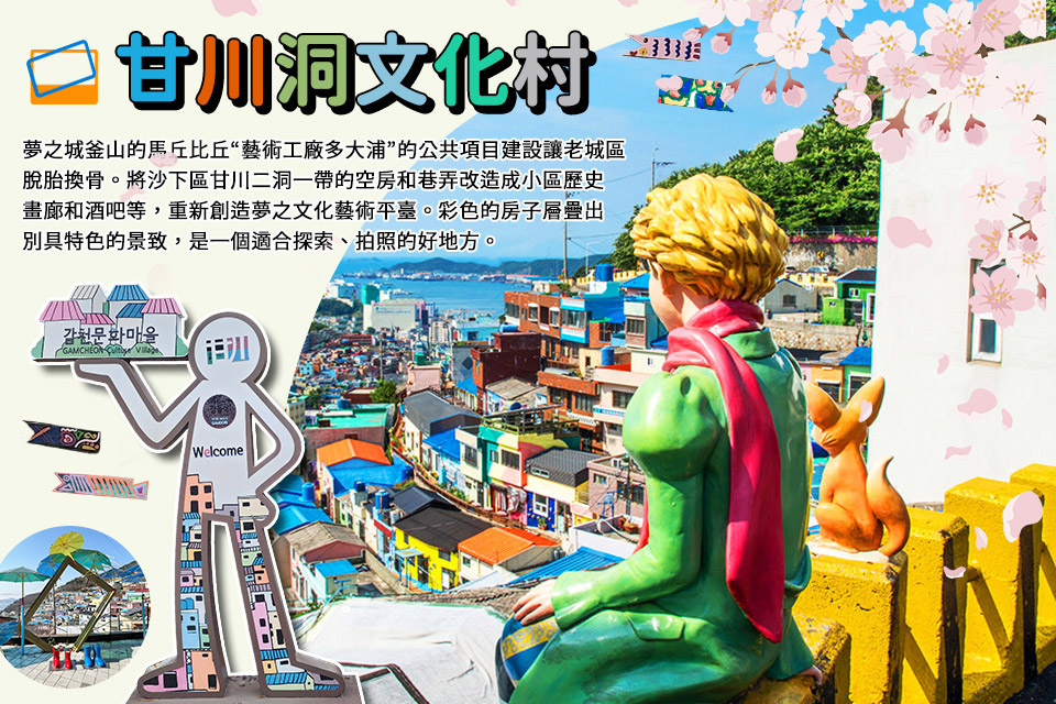 【甘川洞文化村】夢之城釜山的馬丘比丘“藝術工廠多大浦”的公共項目建設讓老城區脫胎換骨。將甘川二洞一帶的空房和巷弄改造成小區歷史畫廊和酒吧等,重新創造夢之文化藝術平臺。彩色的房子層疊出特色的景致,是一個適合探索拍照的好地方。