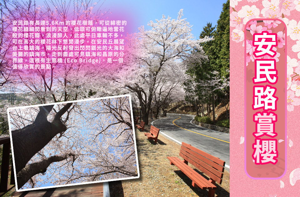【安民路(賞櫻)】安民路有長達5.6Km 的櫻花樹蔭,可從綿密的櫻花縫細間看到的天空,低頭可俯瞰遍地雪花般的櫻花瓣,浪漫醉人。此處平日車輛不多,可在高大的櫻花林下悠閒漫步。在安民丘展望台上看鎮海,陽光反射發出閃閃銀光的大海和美麗的鎮海市。走到盡處可見鎮海和昌原的分界線,這裡有生態橋 (Eco Bridge),是一個值得欣賞的景點。