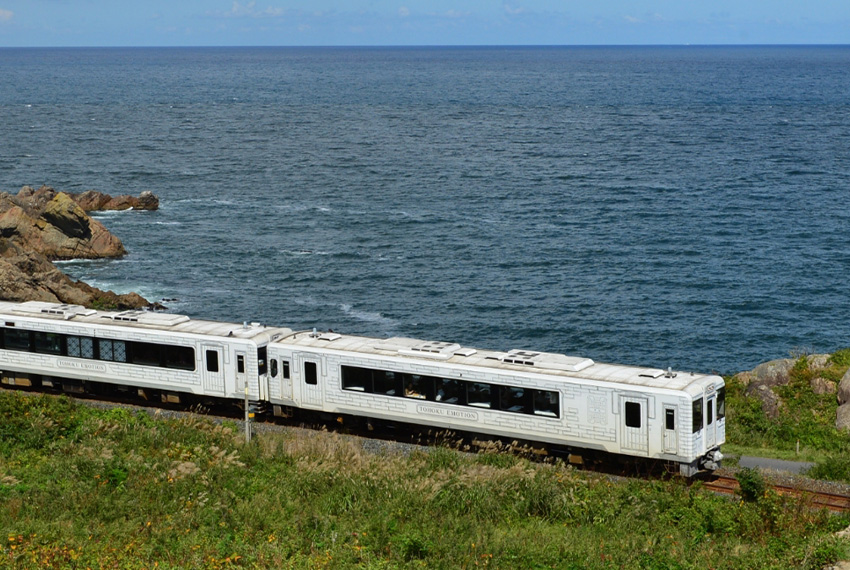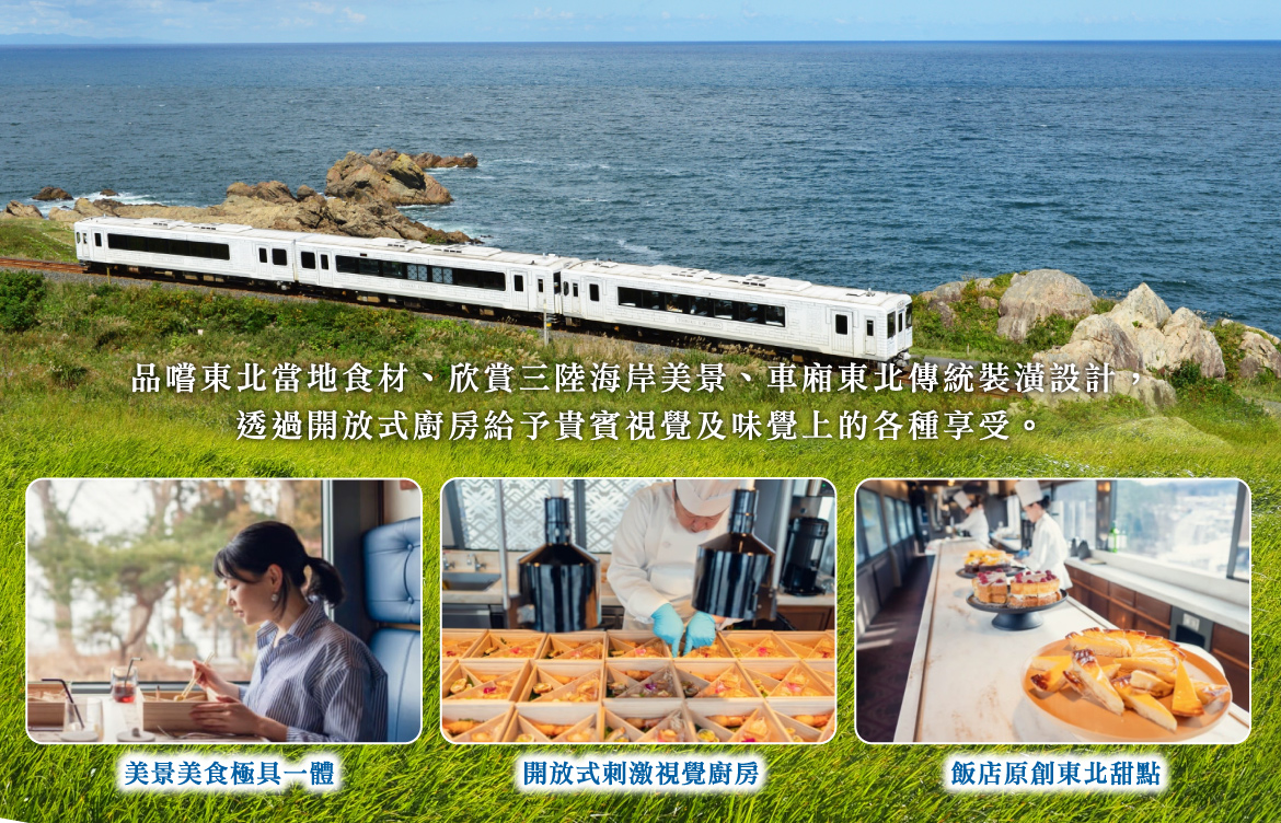 【東北微笑EMOTION列車】是一輛以觀光、美食為主題的夢幻列車,將設計、美食、藝術與自然風景完美融合,每節車廂的內裝設計皆融合東北各地的傳統工藝精髓,如福島的「刺子織」、青森的「津輕小巾刺繡」、岩手的「南部鐵器」等,從燈光、桌飾到牆面紋理,每一處細節都藏著東北的文化氣息。列車上搭載開放式廚房,乘客可一邊欣賞太平洋海岸及山巒景色,一邊細細品嚐由專業料理團隊現場烹調、嚴選東北在地食材打造的創意料理,讓旅客享受一場融合視覺、味覺與文化的多感官特色體驗。
