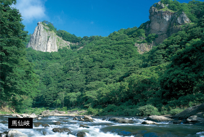 【馬仙峽】為二戶市南方的進出門戶,是流著馬淵川清流、高聳矗立的景點名勝,在1950年左右,由出身二戶市的已故岩手縣知事國分謙吉所命名,於1962年被指定為縣立自然公園。馬仙峽涵蓋了自馬淵川與安比川交流處起至下流的馬淵川溪谷、左岸的男神岩和女神岩、右岸的大崩崖一帶,四季迥異的自然美景,讓眾人為之著迷。