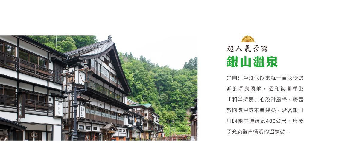 【銀山溫泉】充滿日式懷舊風情的溫泉鄉銀山溫泉,這裡擁有美麗的自然景色,大量保留大正時代建築風格的老式建築,處處散發著浪漫氣息。這裡一年四季都有不同的美景,在漫長的夏日午後,可以隨意穿著浴衣,在田園詩意的街頭慵懶漫步;冬季皚皚白雪覆於屋宇,煤氣燈的柔光更顯迷離,令人久久不能忘懷。