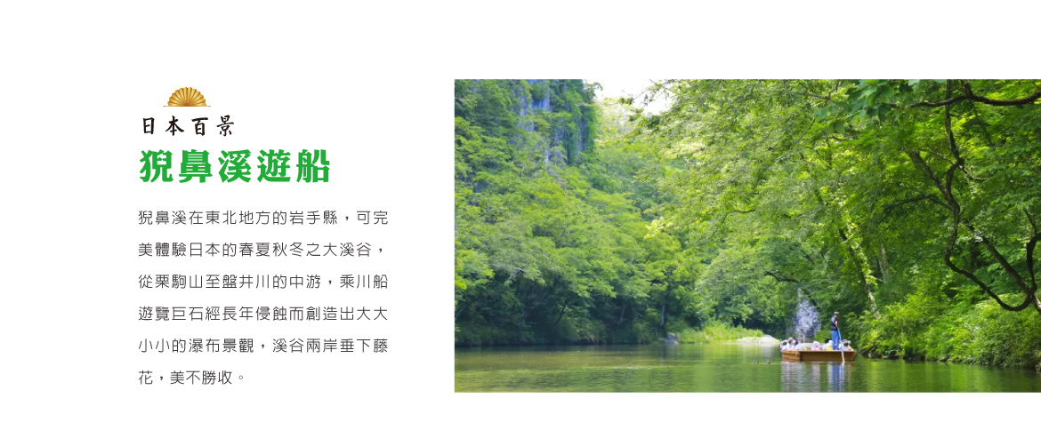【猊鼻溪遊船】是著名的峽谷景勝地,全長約兩公里,由砂鐵川切割而成,兩岸峭壁高達百餘公尺,奇岩怪石林立,隨四季展現不同景色。安排「猊鼻溪輕舟遊覽」,由船夫以長竿掌舵,帶領遊客順流而下再逆流而返,全程約九十分鐘,航程中船夫不僅介紹沿途地形與岩壁名稱,還會吟唱傳統民謠,讓旅人感受當地文化魅力。