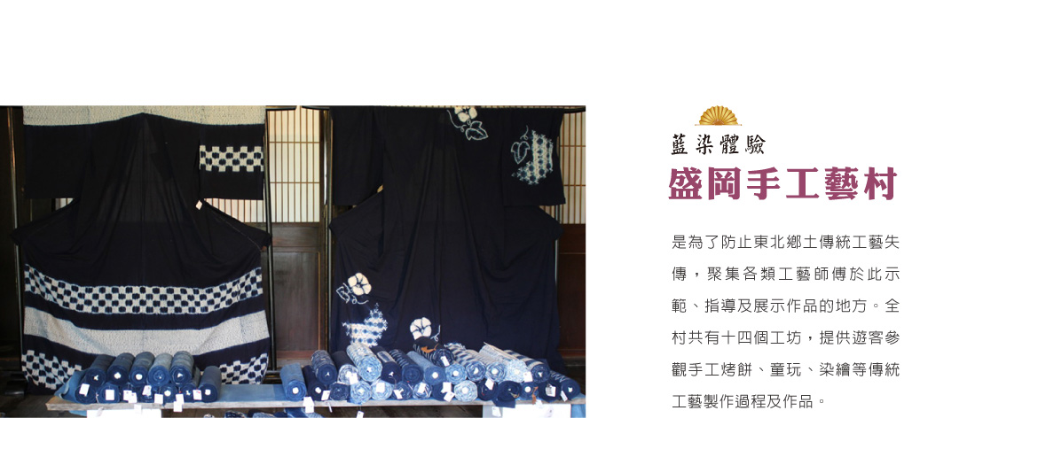 【盛岡手工藝村】是為了防止東北鄉土傳統工藝失傳,由岩手縣政府所建築的綜合工作坊,聚集各類工藝師傅於此示範、指導及展示作品的地方。以「見、觸、作」為營運理念,向遊客介紹及販售具有特色的當地出產製品及傳統工藝品,全村共有十四個工坊,提供遊客參觀手工烤餅、童玩、染繪等傳統工藝製作過程及作品。