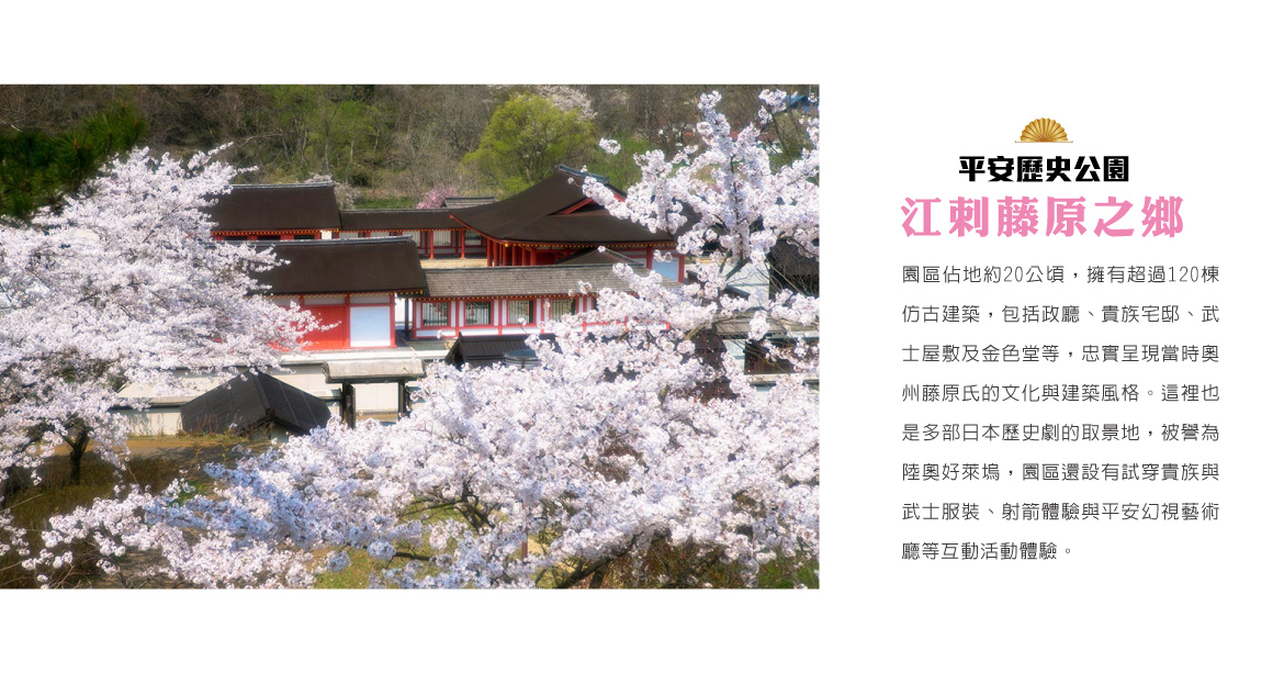 【江刺藤原之鄉】園區佔地約20公頃,擁有超過120棟仿古建築,包括政廳、貴族宅邸、武士屋敷及金色堂等,忠實呈現當時奧州藤原氏的文化與建築風格。這裡也是多部日本歷史劇的取景地,被譽為陸奧好萊塢,園區還設有試穿貴族與武士服裝、射箭體驗與平安幻視藝術廳等互動活動體驗。