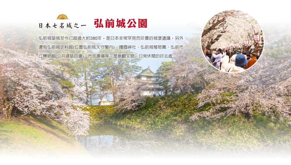 【弘前城】(賞櫻預測4月下旬至5月上旬)弘前城是日本國家指定史蹟,保留許多日本重要的文化遺產,知名作家司馬遼太郎在其著作「行走街道,北方的Mahoroba」中,以「日本七名城之一」介紹弘前城,其代表性可見一斑。弘前城築城至今已超過大約380年,尚保留著天守閣、櫓、城門、護城河等築城形態全貌,歷史建築完整留存,是日本非常罕見而珍貴的城堡遺蹟。
