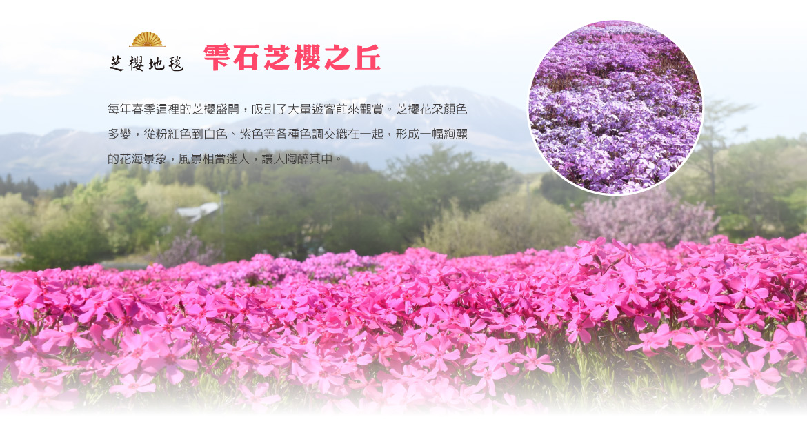 【雫石芝櫻之理】位於日本岩手縣的雫石町,是春季賞芝櫻的知名景點,以其大片粉紅、白色、紫色的芝櫻花海聞名,常與遠處的岩手山同框,形成「富士山」以外另一種獨特的富士芝櫻祭氛圍,讓遊客能欣賞到如地毯般展開的壯觀花景,是體驗日本春季自然美景的絕佳去處。