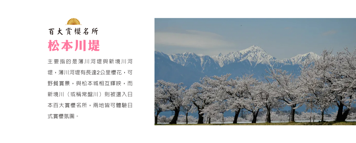【松本川堤~賞櫻】(賞櫻預測4月上旬至4月下旬)主要指的是薄川河堤與新境川河堤,薄川河堤有長達2公里櫻花,可野餐賞景,與松本城相互輝映,而新境川(或稱常盤川)則被選入日本百大賞櫻名所,兩地皆可體驗日式賞櫻氛圍