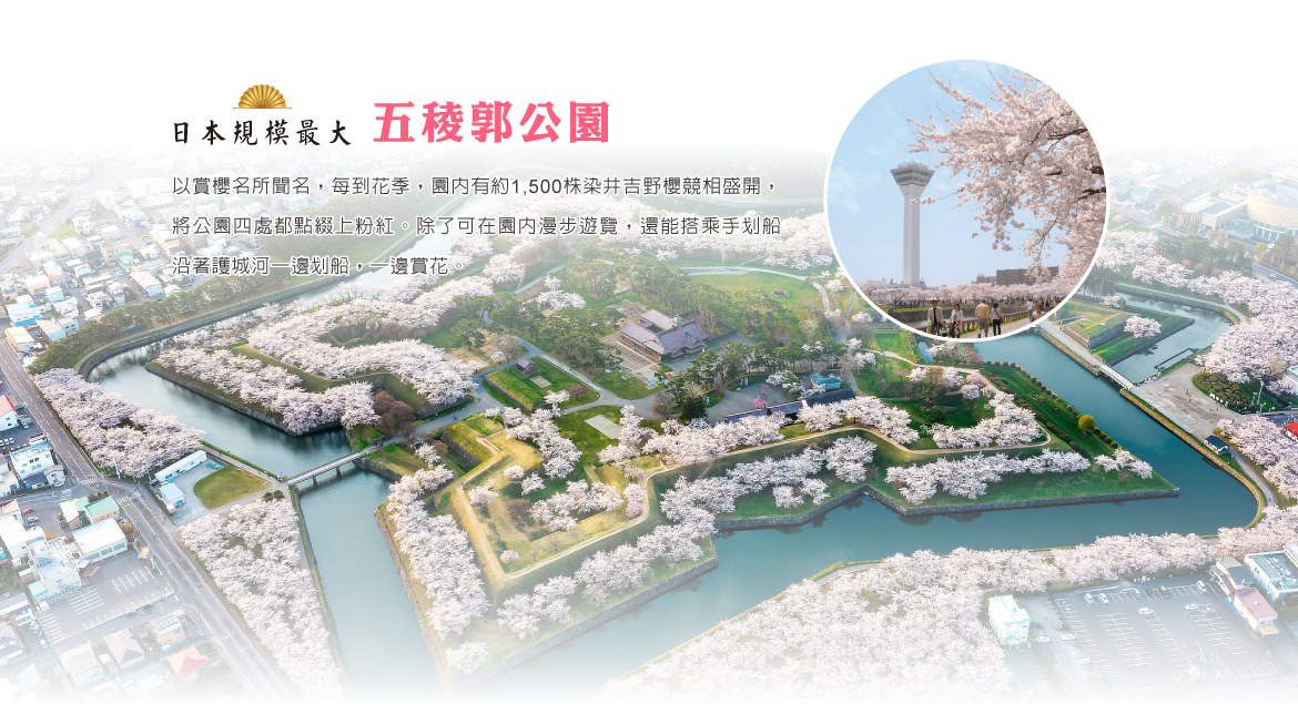 【五稜郭公園】「五稜郭公園」以賞櫻名所聞名,每到花季,園內有約1,500株染井吉野櫻競相盛開,將公園四處都點綴上粉紅。除了可在園內漫步遊覽,還能搭乘手划船沿著護城河一邊划船,一邊賞花。